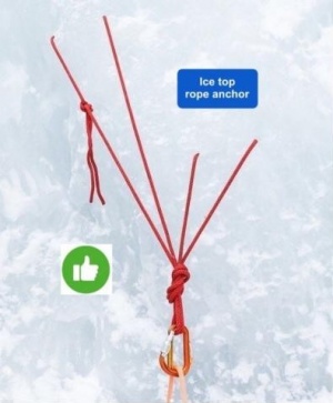 Abalakov, kombiniran z lednim vijakom v sidrišče. Uporabljena je 7 mm vrvica (Vir: Anderle Aljaž).