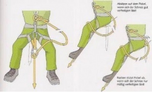 Izdelava sidriča v snegu s pomočjo cepina na katerem sedimo